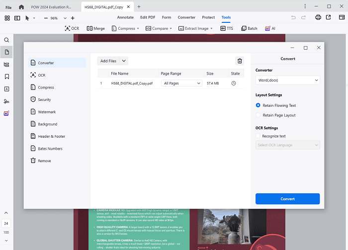 to get into the Batch window, you can add multiple PDF files into the window and batch convert, OCR, compress, security, add watermark, add background, add header & footer, add bates number on PDF files.