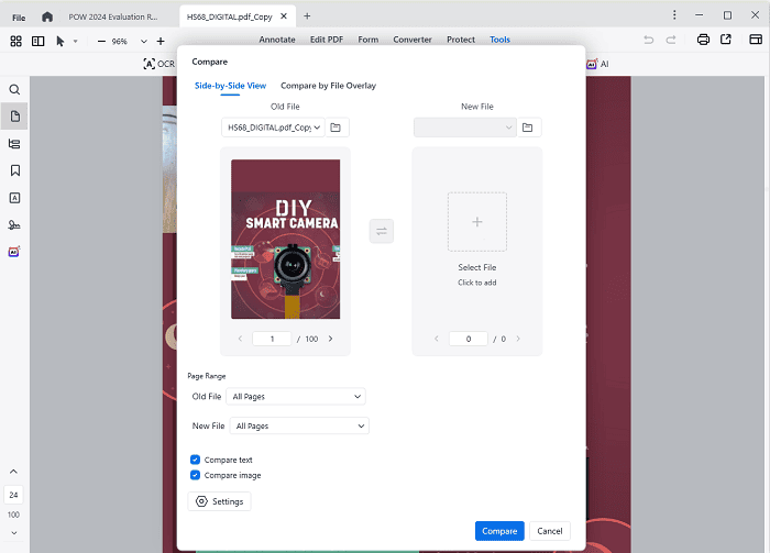 on the tool bar, you are allowed to choose compare side-by-side or file overlay. You can also select the page ranges you want to compare and select to compare text only, image only or both text and image.