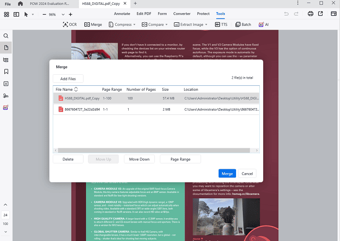 You can use this tool to merge the currently opend PDF and another PDF files. You can adjust the order of those PDF files by clicking "Move Up" or "Move Down", moreover, you can highlight a PDF file and select the page range that you want to merge by clicking "Page Range".
