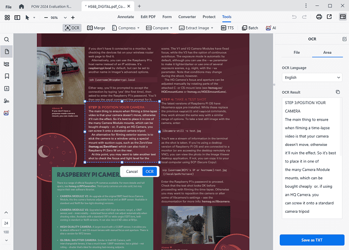 Navitate to Tools on the menu bar, tap OCR, and then navigate to Area on the right panel, move your mouse to frame the texts that you want to extract from your PDF with dotted line box, click OCR under the box. You can then directly copy the ocred texts on the right panel or save them as a TXT file.
