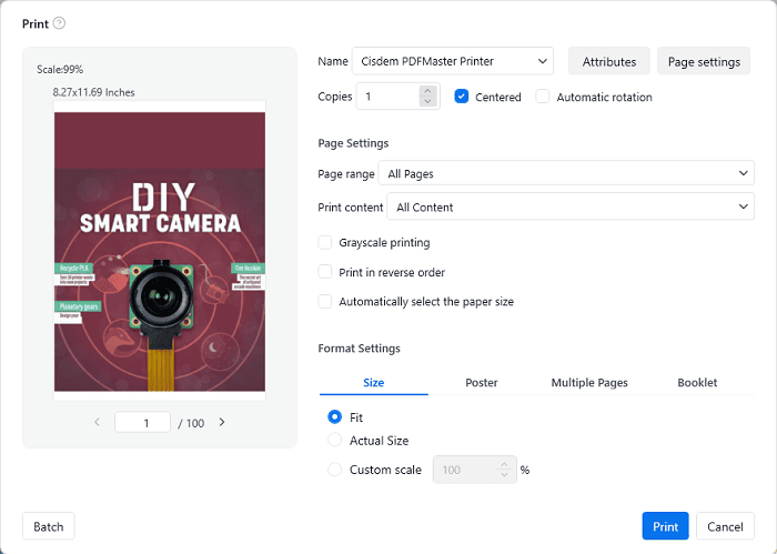 You can directly user Cisdem PDFMaster to print PDF files of Poster, Multiple page or booklet, also you can change the print settings to suit for your needs.