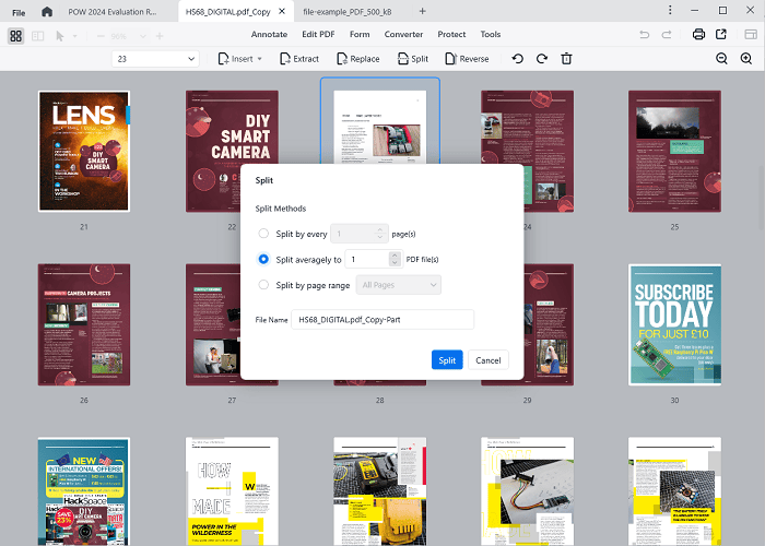 : Click it, it allows you to split every page into seperate files, split averately to multipe PDF file or split by a page range.