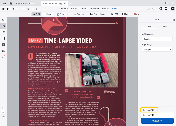 Just navitate to Tools on the menu bar, tap OCR, select language and page ranges on the right panel, click Output and choose Save as PDF.