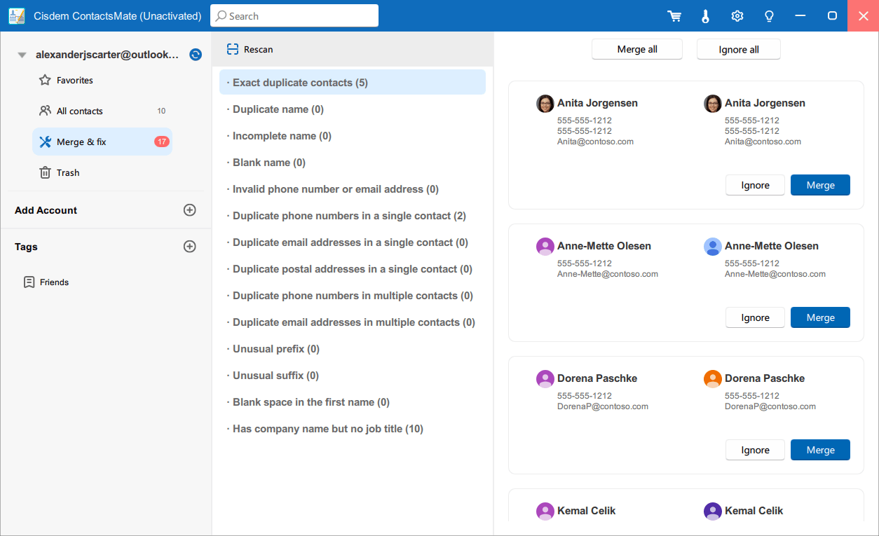 Another very helpful feature is merging duplicates. Cisdem ContactsMate automatically detects exact duplicate contacts, partial duplicates, as well as potentially incorrect contact information.
