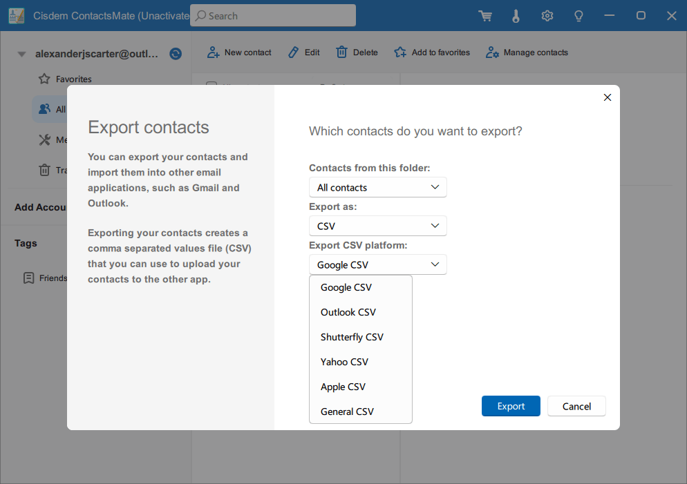 I especially like Cisdem ContactsMate's export feature, which supports three export formats: vCard, XLSX(Excel), and CSV. For exporting contacts to CSV, there are six options available, such as Google CSV and Shutterfly CSV. For example, if you aim to use the exported contacts in Shutterfly's address book, choose the Shutterfly CSV option, since it's design for this service.