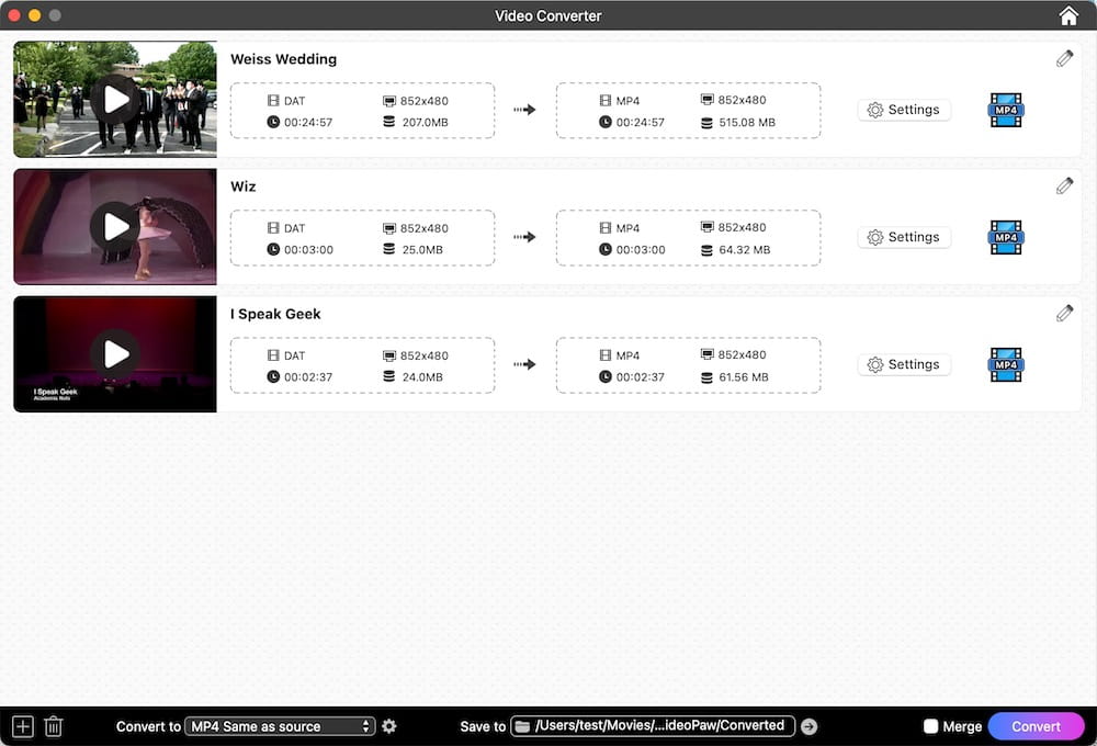 Cisdem VideoPaw is a reliable and versatile DAT to MP4 converter for desktop. It allows you to add individual or multiple DAT video files with whatever codec, size, and resolution. Given that it was taking full advantage of hardware acceleration and the High Quality Engine tech, it excels at batch processing DAT files to MP4 conversion quickly with virtually no quality loss.
