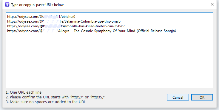 Tip: To parse multiple Odysee links at once, click the "+" on the left and paste them in the pop-up text box. Then click the "OK" button.