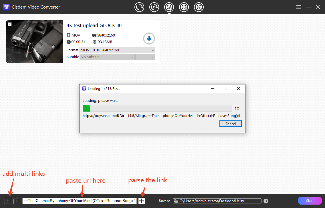 3. Paste the Odysee link into the URL input field of Cisdem and click the "+" on the right to start parsing.