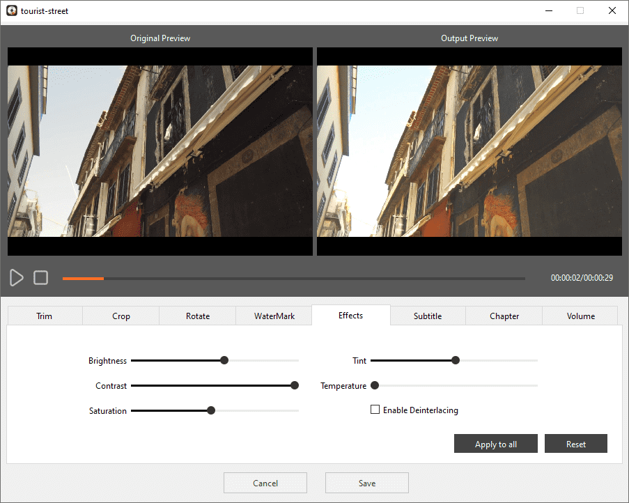 Below each video thumbnail is a brush-like icon. Clicking it allows you to edit the video using 8 different tools. I made the following edits: