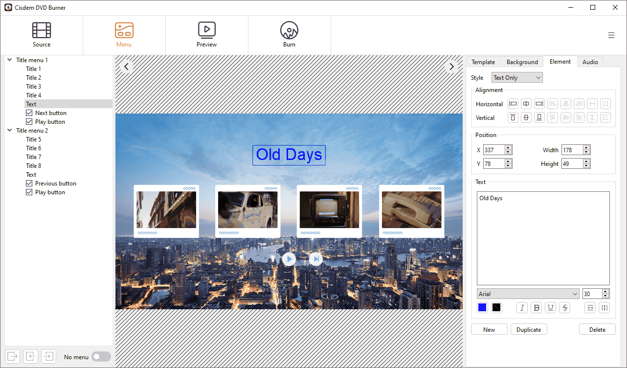 - Changed the DVD title to “Old Days” and added text labels to each video button. I used a large, clear font.