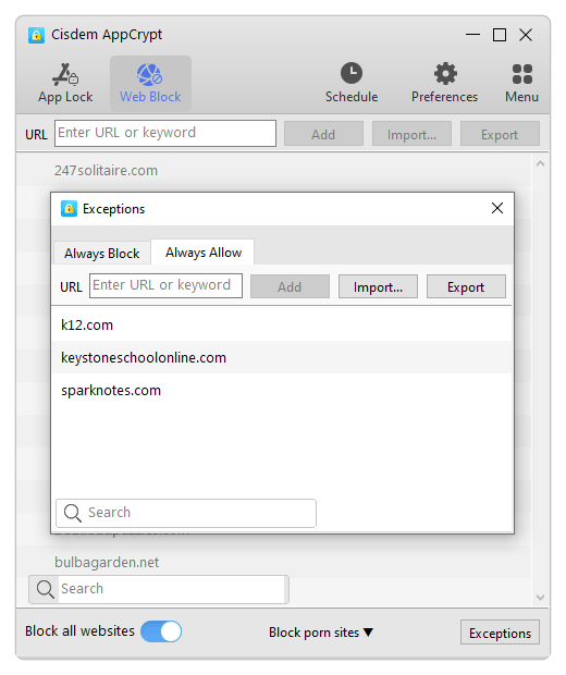 If you want an extremely distraction-free or child-safe environment, you can allow access to certain websites only. Here's how. Turn on Block All Websites, click Exceptions, and add specific sites to the Always Allow list.
