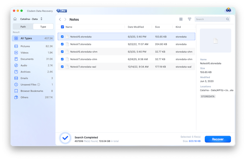 Then go to Type, enter notes in the search box to find all the recoverable notes. The disappeared Notes will be stored in the subfolder Data of com.apple.Notes folder.![recover mac notes cisdem 02]()