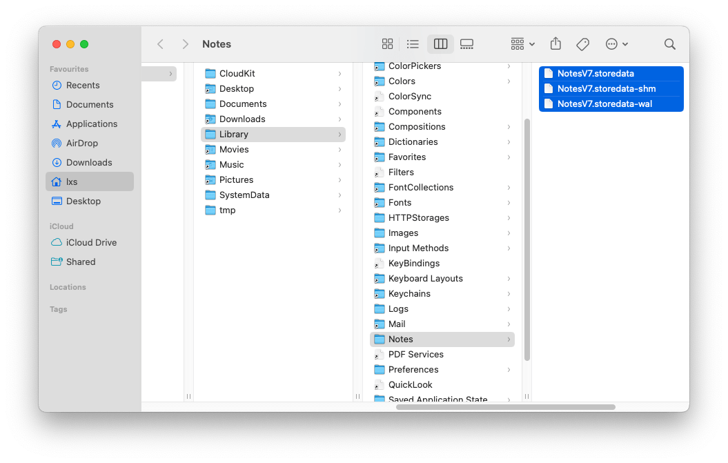 - Go to ~/Library/Containers/com.apple.Notes/Data/Library/Notes/, where your notes are stored.