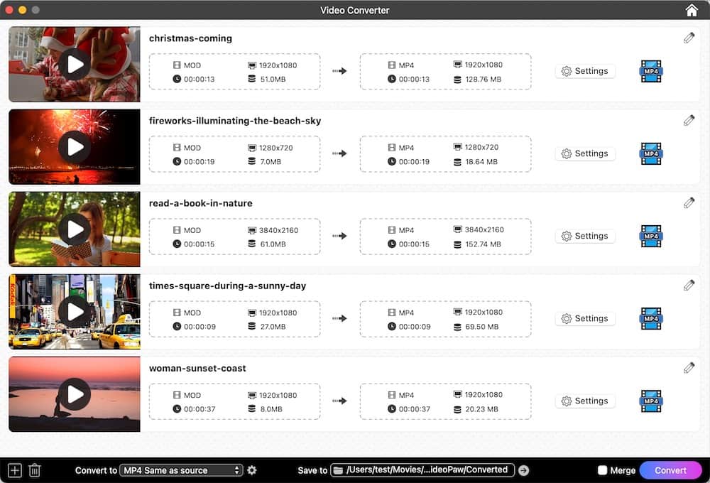 Cisdem VideoPaw is a professional video converter that capable of making conversions among 600+ videos and audios, including MOD and MP4. It ensures fast conversions and supports bulk conversion, so that people can get new high-quality files in a short time with no need to wait in front of the computer all the time.