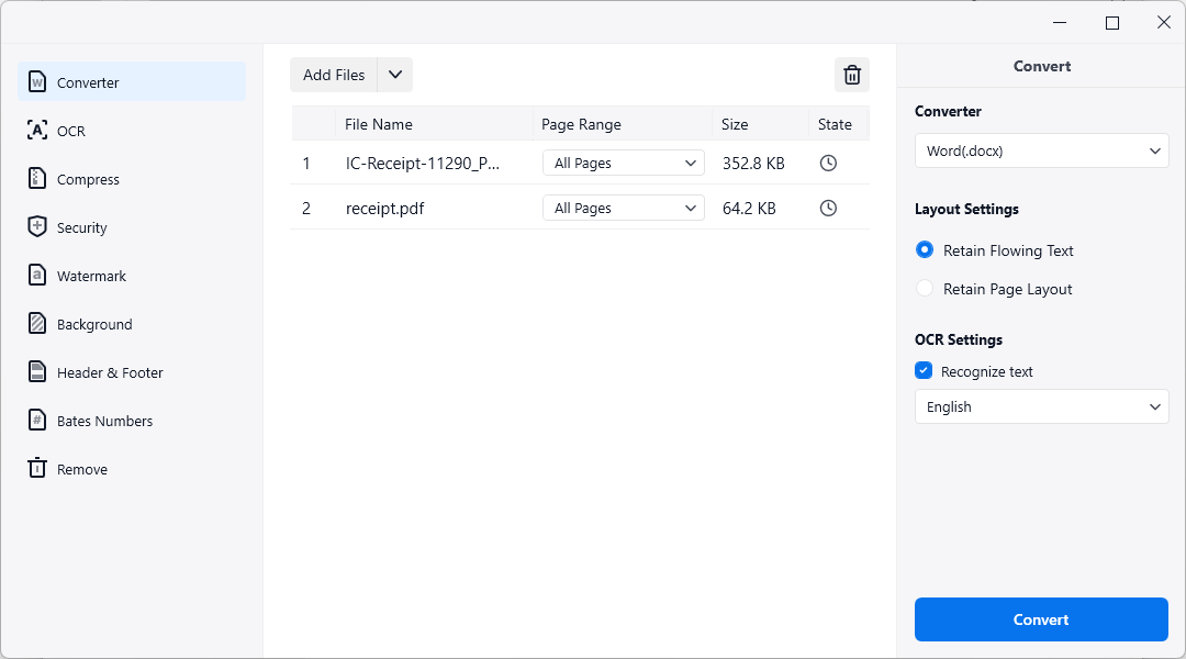 - Convert scanned PDFs and image files into searchable PDFs.