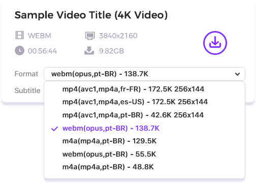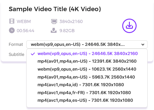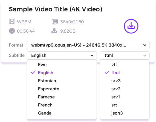 Identify all subtitle tracks within your video source, from AI-generated to creator-uploaded ones. Get subtitles instantly in 100+ languages (if available) and all major formats, and download with your video.